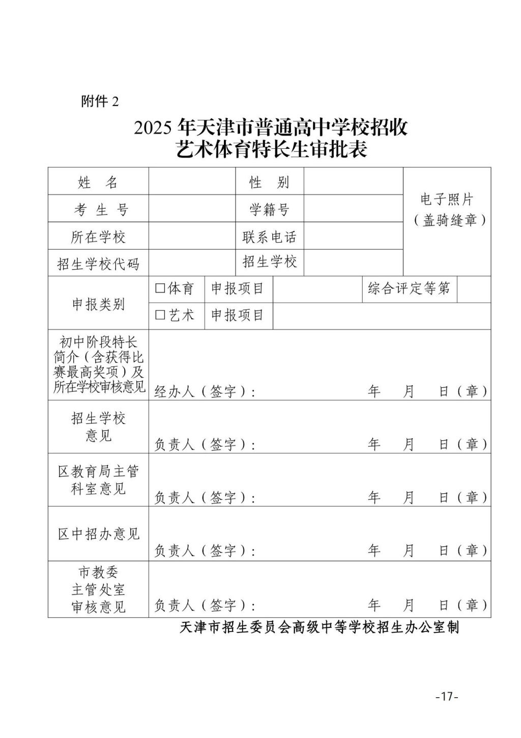 2.2025年天津市普通高中学校招收艺术体育特长生审批表