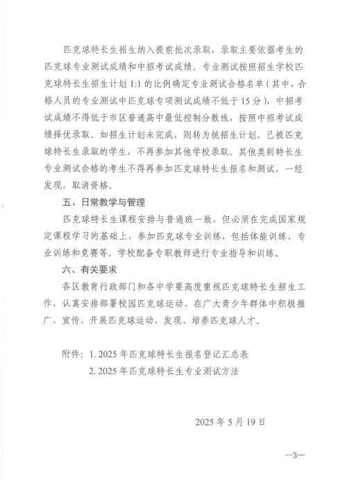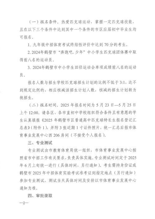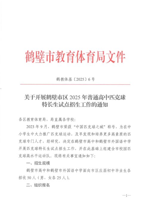 河南鹤壁市区2025年普通高中匹克球特长生试点招生的通知 网友分享 2025-05-27 08:02:38 220005 分享 2025-05-27 08:02:38 加入 收藏 复制 全文 【#中考# #河南鹤壁市区2025年普通高中匹克球特长生试点招生的通知#】©无忧考网从鹤壁市教育体育局了解到,河南鹤壁市区2025年普通高中匹克球特长生试点招生的通知已公布,具体如下: 复制全文