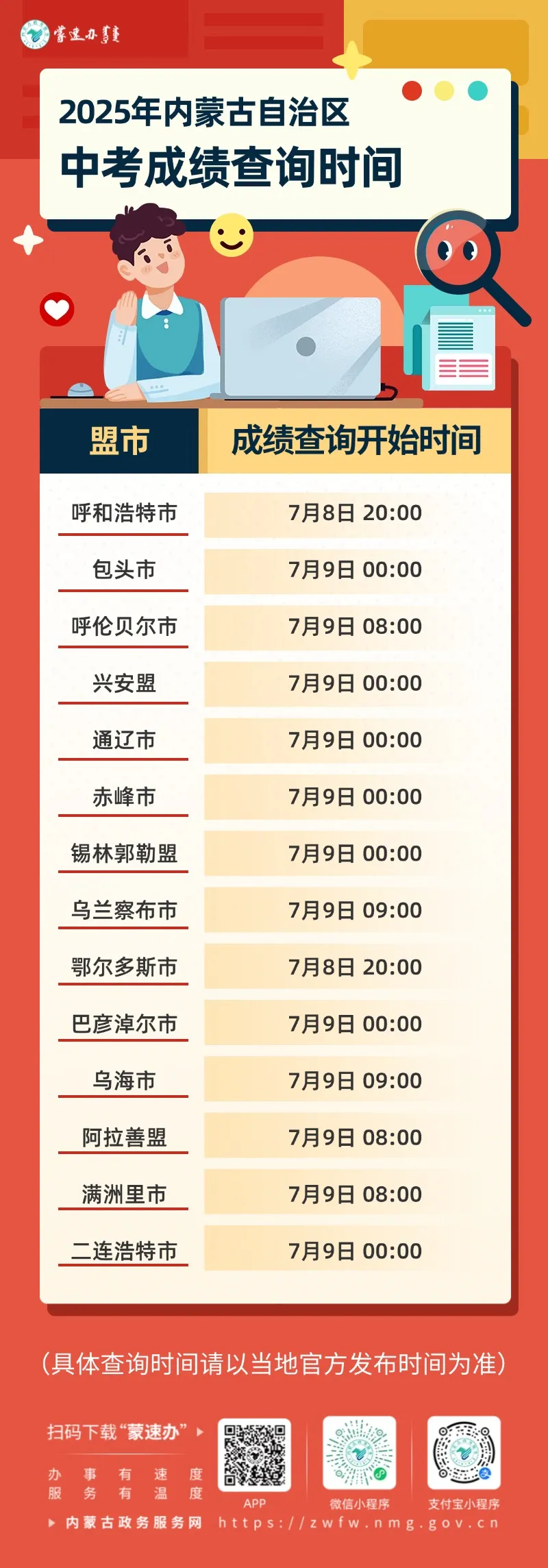 2025年内蒙古各盟市中考成绩7月8日陆续公布,考生和家长可根据各盟市中考成绩查询时间表,登录“蒙速办”移动端或“内蒙古政务服务网”进行中考成绩查询!